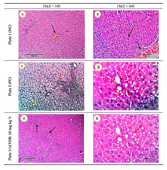 Histopathological photomicrographs of liver tissue (H&E × 100 and 400; A and B) at the end of the experiment. Plate 1: Negative control, Plate 2: Positive control, Plate 3, rats receiving high-fat diet and treated simultaneously with 10 mg kg−1 atorvastatin (ATOR), Plates 4 and 5: rats receiving high-fat diet and treated with Lactobacillus paracasei postbiotic (CFE-1 and CFE-2; at 100 and 200 mg kg−1, respectively). Postbiotic is the cell-free extract (CFE). The blue arrows refer to hydropic degeneration. Yellow arrows indicate macro- and micro-steatosis in a variable number of hepatocytes. The red arrows refer to moderate lympho-plasmocytic inflammatory reaction in the portal triads and the black arrows mark mild biliary proliferation.