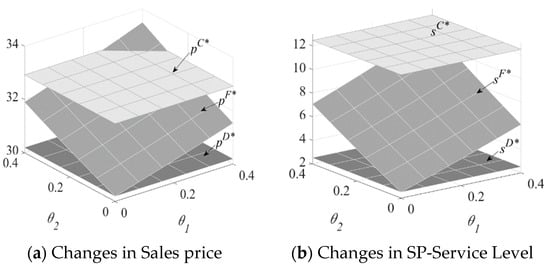 Fourthly, logistics services price, SP-service level, and profits of each member and ESC are maximized under centralized decision-making. However, the sales price in centralized decision-making is not the lowest, but higher than that under a decentralized decision model where ESC members are completely rational, which differs from the findings of the offline or dual-channel supply chains [,].