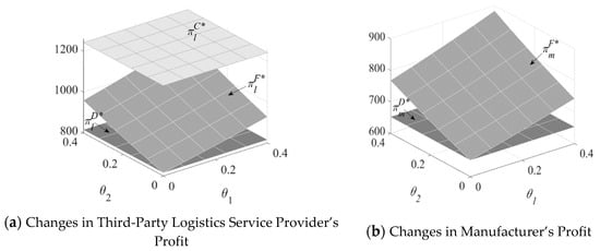 Under the centralized model, close cooperation between e-platform and manufacturer can maintain the SP-service level and the logistics services price at relatively high levels, which can increase market demand and profit of the TPLSP. Moreover, the sales price is lowest under decentralized model where members are perfectly rational, and the comparison of sales price in the other two decision models depends on the degree of the e-platform’s altruistic preference. When the e-platform is less altruistic (), the highest the sales price is achieved under centralized decision-making. When the degree of altruistic preference is large (), the sales price is highest under decentralized decision-making with the e-platform’s altruistic preferences. This finding differs from the “lowest selling price under centralized decision-making” conclusion of offline or dual-channel supply chains [,,]. In ESC models, the sales price under centralized decision-making is consistently higher than that under decentralized decision-making where members are perfectly rational. This is because the price is no longer the only consideration for consumers when they purchase products. Coupled with the uncertainty and complexity of the online shopping process, consumers are increasingly expecting e-platforms to provide better sales and after-sales service and are willing to pay more for it.