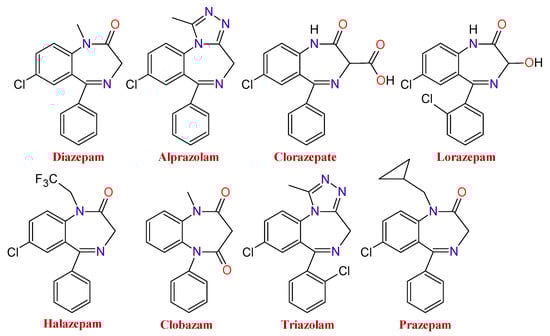 For the treatment of anxiety and depression, BDZs are the preferred medicines in the pharmacological sphere due to their fast stating of action, efficiency, the least number of collateral effects, and the minimal acute toxicity compared to other medications []. BZDs are usually helpful in saving the patient’s life in a wide range of clinical disorders such as panic, phobias, or different types of epileptic seizures or those caused for drug overdoses. BZDs have also been shown to be highly effective in treating alcohol withdrawal symptoms, to be used as anesthesia, and also as adjuvants in the treatment of muscle spasms [].