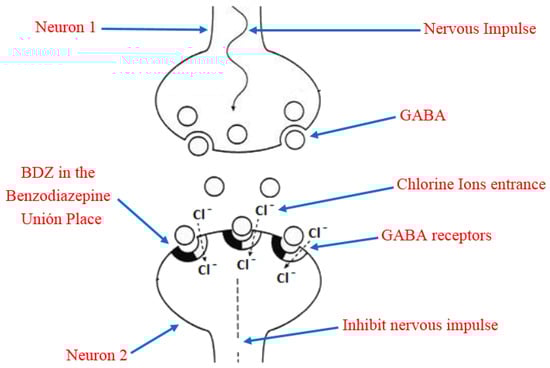 Due to its high solubility in lipids, BDZ can penetrate the brain and cause rapid and effective action through interference with the nerve impulse transmission mechanism []. In order to understand this, it is necessary to keep in mind that the main inhibitory neurotransmitter of the central nervous system is the γ-aminobutyric acid (GABA), which has a reception place in the neurons acquiesced by a heteropentameric glycoprotein. This protein is coupled in the central nervous system, more abundant in ionic channels through which chloride ions selectively transit, they also have a site for the reception of the BDZ, known as Benzodiazepine Union Place. The BDZ bind to the binding site and modify the three-dimensional disposition of the receptor (allosteric modulation) [,], favoring the opening of the chloride channel by the action of GABA (Figure 4). The former process is the potentiation of the inhibitory effect of the GABA neurotransmitter so that the neuron becomes less excitable and begins to be in a neuronal inhibition state. In addition, the permanent activation of GABAA receptors causes adaptative changes that result in tolerance [].