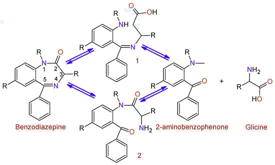BDZs are metabolized in the liver with the intervention of microsomal enzyme systems. The first stage of the process (Figure 5) is the hydrolysis of the Diazepine ring at positions 2 or 5 in order to obtain the intermediates 1 and 2; afterward, a hydrolysis process takes place to produce 2-aminobenzofenona and glycine, which are excreted through the urine.