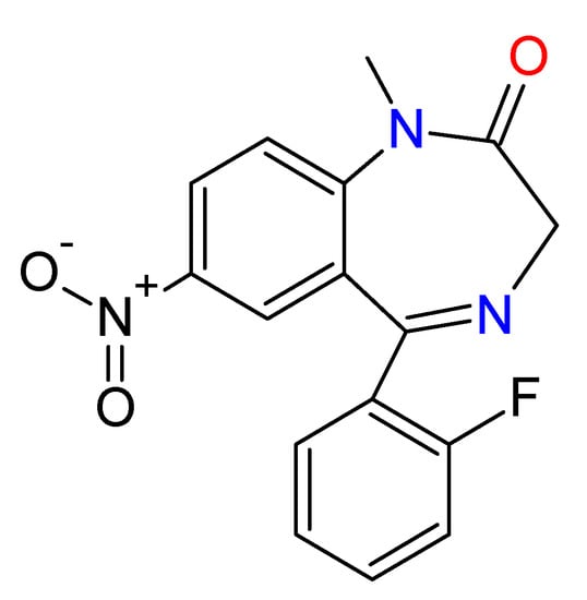 - Qian, Z.; Liu, C.; Huang, J.; Deng, Q.; Hua, Z. Identification of the designer benzodiazepine 8-chloro-6-(2-fluorophenyl)-1-methyl-4H-[1,2,4]triazolo[4,3-a][1,4] benzodiazepine (flualprazolam) in an anesthesia robbery case. Forensic Toxicol. 2020, 38, 269–276. [Google Scholar] [CrossRef]