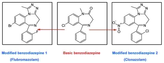 To the aforementioned problems, we have to add that it is currently possible to find associated drugs known as “designed benzodiazepines” on the market, belonging to the new group of drugs called “new psychoactive substances” (NSP). These substances, which are obtained by modifying the basic BDZs (Figure 9), have not been approved as medicines, so they could be dangerous for the health of consumers [,].