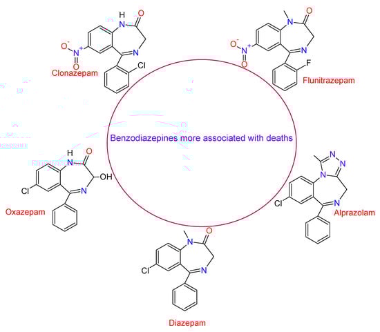 According to a study carried out by the United Nation Office on Drug and Crime (UNODC), between 1999 and 2013, in the United States, the mortality rate in which the use of BDZs was involved increased by 514%, while the number of deaths caused by the use of BDZs mixed with opioids increased to 175,000 deaths. The BDZs most associated with deaths were Clonazepam, Flunitrazepam, Oxazepam, Alprazolam, and Diazepam, with the last two substances having the highest mortality rates between 2010 and 2014 []. Figure 10 shows the structure of these compounds. A study carried out in 2019 by Baillargeon et al. in older adults with chronic obstructive pulmonary disease revealed that the use of opioid and benzodiazepine alone or in combination were associated with increased adverse respiratory events [].
