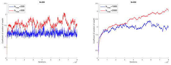 To prove that the critical parameter affecting the numerical output of the model is , in Figure 5, we report the trends of the coefficient of variation of the amount of money of the economic agents as transactions go on for , in the case where initially all economic agents have the same amount of money, and of monetary value of the goods/services (both equal to ). In such a way, all agents enter the market with the same conditions, and inequality arises only as a consequence of the random fluctuations induced by transactions.