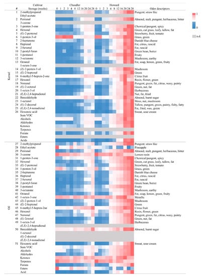 Heatmap showing changes in the individual volatile compound concentration (n = 3) at 11-time points during 28 weeks of storage of Chandler and Howard kernels. Concentrations of each volatile are relative to the maximum concentration of the same volatile detected across samples. Blue color represents the lower concentration (0), while dark pink color represents the higher volatile concentration (1). Compounds non detected (n.d.) are represented in grey color. Odor descriptors from database flavornet.org and other authors [,,].