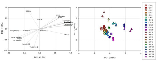 The results shown previously indicate that the chemical composition of walnut kernel and oil were affected by the storage. Moreover, oxidative stability, PV, K232, and K236 are higher in ‘Howard’ than in ‘Chandler’. Using PCA and HCA, we aimed to distinguish different oxidation levels and understand which chemical analysis and compounds are better related to kernel oxidative stability. These compounds might be better indicators of kernel oxidative stability during storage.