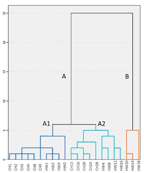 Hierarchical dendrogram for ‘Chandler’ (CH) and ‘Howard’ (HW) samples from 28 weeks of storage.