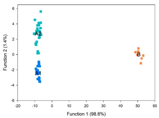 To further explore the possibility to separate samples into distinctive oxidation groups using the variables measured, HCA was performed. The two factors extracted from PCA were applied to HCA to explore the heterogeneity of the samples. As illustrated in Figure 3, the samples can be divided into two clear clusters: Groups A (lowest oxidation) and B (highest oxidation). Two sub-clusters were detected under group A: A1 (no oxidation) and A2 (low oxidation). The grouping results are similar with the results of PCA (Figure 2B), which illustrates that samples with longer storage time differ from those of short storage time, especially in ‘Howard’ samples. Though the results from PCA and HCA are useful to preliminarily distinguish kernel oxidation levels, sample size is limited and does not allow further application (e.g., different cultivars).