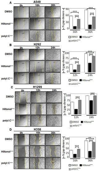 PolyI:C (polyinosinic-polycytidilic acid) has been shown to suppress the proliferation and survival of lung cancer cells [3]. Hiltonol (also known as poly-ICLC) is an advanced polyI:C synthetic RNA designed by stabilizing polyI:C with poly-lysine. Hiltonol has been shown to induce immune response against established tumors [4,5]. However, understanding the mechanism of anti-tumorigenic action of Hiltonol, especially that of lung cancer is important, albeit hitherto unexplored. Thus far, Hiltonol has only been applied as an investigational adjuvant to stimulate immune cells such as CD8-T cells and dendritic cells in cancer patients. This is despite recent clinical trial on lung cancer patients (https://immuno-oncologynews.com/2018/05/29/first-lung-cancer-patient-treated-with-neo-pv-01-phase-1-trial/ (accessed on 6 October 2020)), which was designed to evaluate the safety and tolerability of NEO-PV-01, administered alongside Hiltonol, Keytruda, and Alimta (pemetrexed) and Paraplatin (carboplatin).