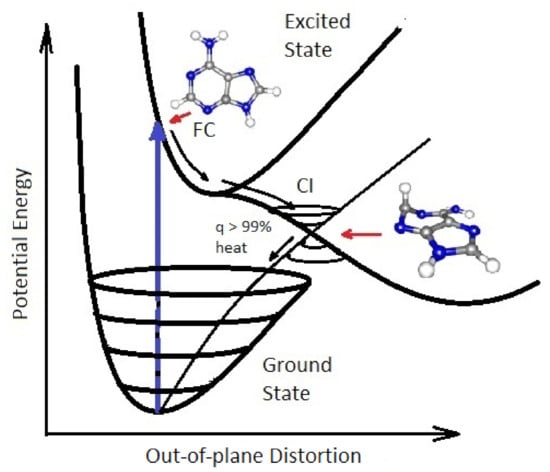Conical Intersection (CI) for adenine showing the degeneracy of the electronic excited state with the electronic ground state after a UVC photon absorption event (blue arrow) which induces a nuclear coordinate deformation from its original structure in the Franck-Condon (FC) region, known as pyramidalization. Conical intersections provide rapid (sub-picosecond) dissipation of the electronic excitation energy into heat. The quantum efficiency (q) for this dissipative route is very large for the fundamental molecules of life, making them photochemically stable but more importantly very efficient at UV photon dissipation. Another common form of coordinate transformation associated with conical intersections are proton transfers within the molecule or with the solvent. Based on data from Andrew Orr-Ewing [] Roberts et al. [], Kleinermanns et al. [] and Barbatti et al. []
