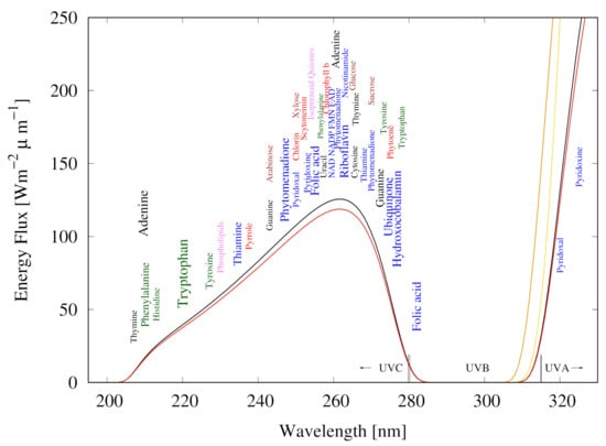 The spectrum of light available in the UV region at Earth’s surface before the origin of life at approximately 3.9 Ga and until at least 2.9 Ga (curves black and red respectively) during the Archean. CO and probably some HS were responsible for absorption at wavelengths shorter than ∼205 nm and atmospheric aldehydes (common photochemical products of CO and water) absorbed between about 285 and 310 nm [], approximately corresponding to the UVB region. Around 2.2 Ga (yellow curve), UVC light at Earth’s surface was extinguished by oxygen and ozone resulting from organisms performing oxygenic photosynthesis. The green curve corresponds to the present surface spectrum. Energy fluxes are for the sun at the zenith. The names of the fundamental molecules of life are plotted at their wavelengths of maximum absorption; nucleic acids (black), amino acids (green), fatty acids (violet), sugars (brown), vitamins, co-enzymes and cofactors (blue), and pigments (red) (the font size of the letter roughly corresponds to the relative size of their molar extinction coefficient). Indications that dissipative structuring occurred at the origin of life are that the absorption wavelengths of these fundamental molecules coincide with the Archean UV surface spectrum and that many have a peaked conical intersection to internal conversion. Adapted from Michaelian and Simeonov [].