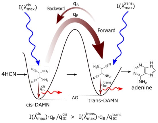Mechanism for the evolution of molecular structures towards ever greater photon dissipative efficacy (microscopic dissipative structuring) on route to the fundamental molecules (in this case adenine, see Figure 4). The high activation barriers between configurations mean that reactions will not proceed spontaneously but only through coupling to photon absorption events. Forward and backward rates depend on photon intensities at the different wavelengths of maximum absorption I for the two structures, and on the phase-space widths of paths on their excited potential energy surface leading to the conical intersection giving rise to the particular transformation, implying different quantum efficiencies for the forward (q) and backward (q) reactions. Since the intensity of the incident spectrum is assumed constant, and since and (where the “⋯” represents quantum efficiencies for other possible molecular transformations), those configurations (and also macroscopic concentration profiles) with greater photon dissipative efficacy (higher quantum efficiency for internal conversion q) will therefore gradually become more predominant under a continuously impressed UVC photon flux, independently of the sign or size of the difference in the Gibb’s free energies G of the molecules.
