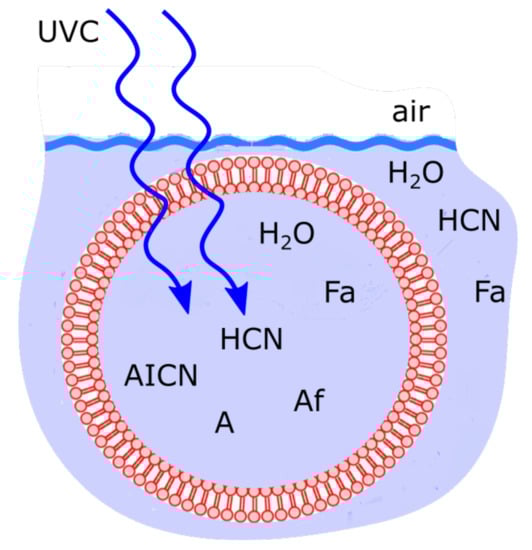 Fatty acid vesicle floating at the ocean surface microlayer, transparent to UVC light and permeable to HO, HCN and formimidic acid (Fa) but impermeable to the photochemical reaction products (e.g., ammonium formate (Af), AICN, adenine (A)) which are larger in size and have larger dipole moments (Table 1).
