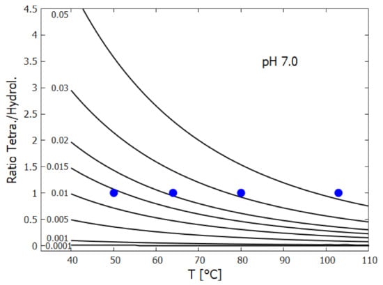 - HCN (H) thermally polymerizes into (HCN) with its most stable tetramer () known as cis-DAMN (C) being the preferred polymer from which more complex polymers can be synthesized []. The tetramization of 4HCN is an exothermic thermal reaction and occurs most rapidly at a solvent pH at its pKa value, which decreases with increasing temperature (pKa at 60 C and at 100 C) []. The tetramization of HCN into DAMN is not elementary but involves successive polymerization of HCN with H and CN ions [] so is second order in the concentration of HCN. The temperature dependence of the rate of conversion of HCN to DAMN has been measured by Sanchez et al. []. We assume transition state theory and an Arrhenius equation of form,From the conversion rates for a 1 M solution of HCN with 0.01 M tetramer catalyst as given in Table 5 of Sanchez et al. [], a straight line can be fitted to the graph of vs giving values of and , or kcal mol. However, this would be the rate equation for tetramerization of HCN at its pKa value which would be about 8.2 at 80 C []. To obtain the rate equation at the lower pH value assumed here of 7.0 we note that from Figure 14 of Sanchez et al. [] the half-lives for tetramization of HCN are the same for pH 7.0 at 80 C as they are for pH 8.2 at 64 C (1 day). Setting the rate constants as the same for these two conditions leads to a value of for pH 7.0. Finally, since HCN can polymerize into either cis-DAMN (C) or trans-DAMN (T), and since trans-DAMN (T) has a free energy of [] (0.56 []) kcal mol higher than cis-DAMN (C) a Boltzmann factor of is included for cis-DAMN and the same factor but with for trans-DAMN.The rates for hydrolysis and polymerization are similar for concentrations of HCN (H) between approximately 0.01 M and 0.1 M (equal rates at 0.03 M for pH 7, T = 80 C, Figure 15 of reference []). At lower concentrations, hydrolysis dominates while at higher concentrations polymerization dominates [].