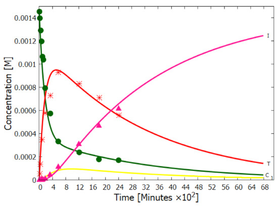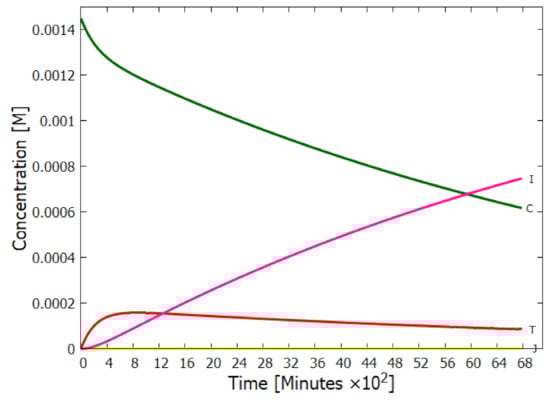 - The absorption of a photon at 313 nm excites trans-DAMN which then transforms into AIAC through proton transfer from one of the amino groups []. Although there does not appear to exist a quantum yield for this photochemical reaction in the literature, the quantum yield for trans-DAMN to AICN (T→ I) has been measured by Koch and Rodehorst [] to be 0.0034. By fitting our model concentration results to the experimental data of Koch and Rodehorst (see discussion of Figure 8) it is found that a best value for the quantum yield of trans-DAMN to AIAC (T→J), , is 0.006 and therefore the quantum yield for AIAC to AICN (J→ I) would be .