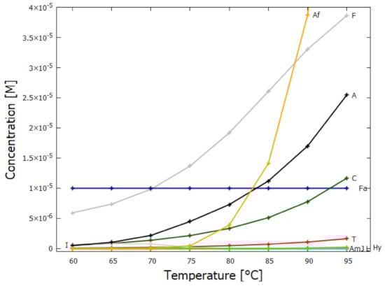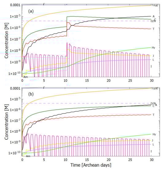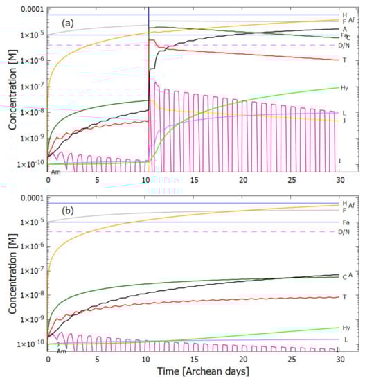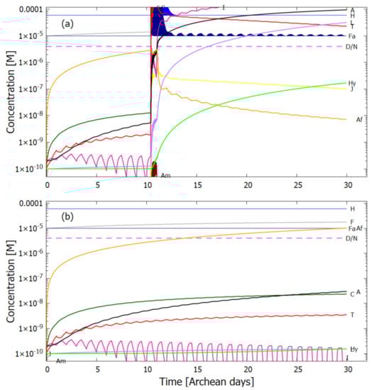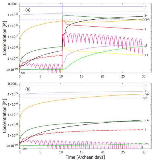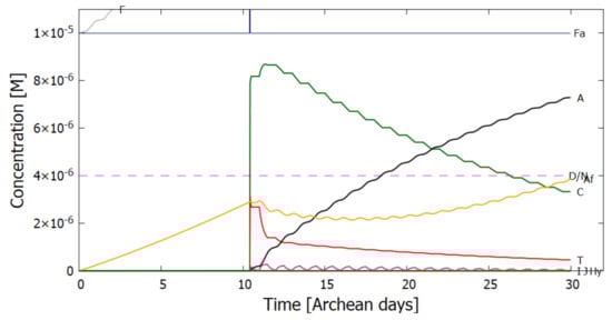 In the following subsection I present a simplified out-of-equilibrium kinetic model for our 5HCN → adenine photochemical reaction system occurring within a fatty acid vesicle floating within the surface microlayer of a hot (∼80 C [,,]) Archean ocean under the UV surface spectrum of Figure 2. It is assumed that that the system is under a diurnal 8 h flux of sunlight followed by an 8 h period of darkness during which thermal reactions occur but not photochemical reactions. The system is assumed to be perturbed by the existence of sparse patches of relatively high concentration ( M) of HCN and formimidic acid (Fa) (a photon-induced tautomer of its hydrolysis product formamide (F)) into which our vesicle is assumed to drift for a brief period (120 s) only once during 30 Archean days.