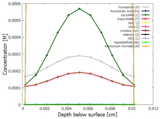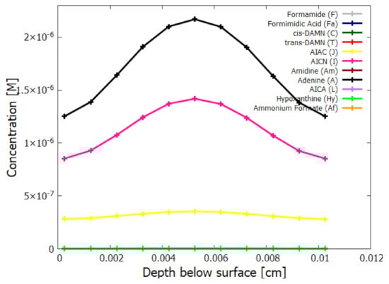 - After the attachment of a fifth HCN (H) to AICN (I) to form the amidine (Am), reaction #14, a subsequent tautomerization is required (calculated to have a high barrier of about 50 kcal mol) which, once overcome, allows the system to proceed through a subsequent barrier-less cyclicization to form adenine []. Such a high barrier to the final cyclicization means that, at the temperatures considered here, it cannot be a thermal reaction. Indeed, the fact that adenine has been found in space and in meteorites where temperatures are expected to be very low, indicated to Glaser et al. [] that a photochemical route must be available. They suggested a photon-induced tautomerization of amidine, which absorbs strongly at 250 nm. Although oscillator strengths for the tautomerization have been calculated by Glaser et al., different ab initio approaches give significantly different values, so experiment will be required for its reliable determination. Therefore, until such data becomes available, we assume a similar molar extinction coefficient as for AICN and, being conservative, a quantum efficiency of but measure the effect on adenine production for a % variation of this parameter value (see Table 4). In fact, the results of Table 4 indicate that due to the large activation energy required, and the fact that the reactions are of second order, reactions #14 and #15 only come into play at very high temperature.