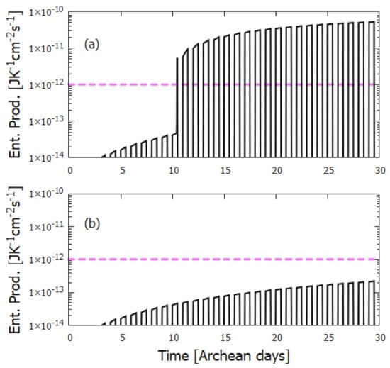 Therefore, in contradistinction to the generally held view that UV wavelengths were detrimental to early life and thereby induced extreme selection pressure for mechanisms or behavioral traits that protected life from, or made life tolerable under, these photons [,,,], it is argued here that these wavelengths were not only fundamental to the photochemical synthesis of life’s first molecules (as suggested with increasing sophistication by Oparin [], Haldane [], Urey [], Sagan [] and Mulkidjanian [] and supported experimentally by Baly [], Miller [], Oro and Kimball [], Ponnamperuma et al. [,,], Ferris and Orgel [], and Sagan and Khare [] as well as others) but that this UV light was fundamental to the origin and early existence of the entire thermodynamic dissipative process known as “life”, comprising of synthesis, proliferation, and evolution (Figure 3) leading to concomitant increases in biosphere photon dissipation over time.