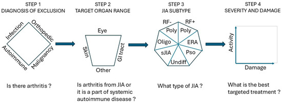 Background/Objectives: Juvenile Idiopathic Arthritis (JIA) is the most common autoimmune rheumatic disease in children and can vary in presentation based on the properties of the JIA subtypes. Timely diagnosis and intervention are essential for maximizing quality of life, healthy growth and development, and prevention of long-term disability. This review aims to provide a clinically practical framework for the core elements important in recognition, monitoring, and management of JIA. Methods: We performed a narrative review of the current literature, complemented by real-world clinical experience from academic rheumatology practice. The review synthesizes evidence-based knowledge with practical insights to develop an approach that can be applied in daily clinical decision-making. Results: We propose a structured, stepwise method for evaluating suspected JIA, emphasizing the integration of pattern recognition with differential diagnosis. Our framework emphasizes two principal parameters: (1) the distribution of joint involvement (peripheral vs. axial) and (2) the presence of extra-articular manifestations, including uveitis, cutaneous findings, and gastrointestinal symptoms. This format aids in distinguishing major JIA subtypes and highlights their distinctive features. In addition, we review overarching principles for monitoring, assessing risk for uveitis, and treatment, and the importance of multidisciplinary care. Conclusions: This structured approach is intended to support clinicians in the accurate recognition of JIA and its subtypes, facilitate early diagnosis, and provide insights on management strategies that improve patient outcomes.