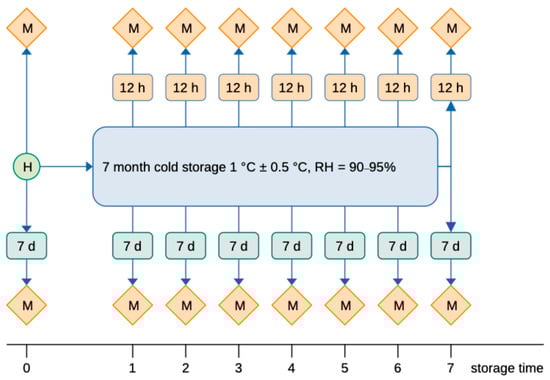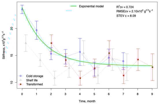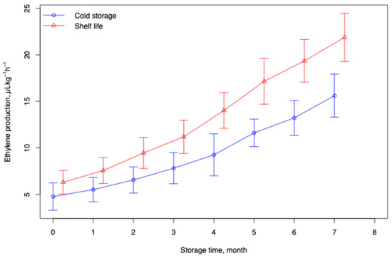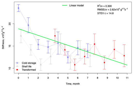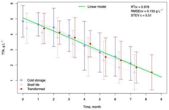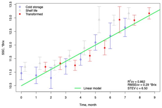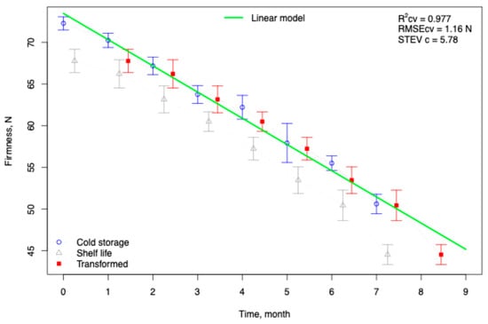 Apple firmness, soluble solids content (SSC), and titratable acidity (TTA) were modeled when fruit were kept under cold storage and shelf-life conditions. These attributes are key indicators of fruit quality, storability, and organoleptic properties. Apple fruit of the ‘Irene’ cultivar were stored at 1 °C for 7 months, with quality assessed monthly and after 7 days of shelf life. Models based on the Storage Time Equivalent Value (STEV) were applied to predict firmness, SSC, and TTA as functions of time in cold storage and shelf life. Rates of change were higher during shelf life, with acceleration factors of 5.78 for firmness, 6.50 for SSC, and 5.51 for TTA. Model performance was high (R2CV = 0.977, RMSECV = 1.16 N for firmness; R2CV = 0.862, RMSECV = 0.29 °Brix for SSC; R2CV = 0.978, RMSECV = 0.155 g L−1 for TTA). The proposed approach integrates cold storage and shelf life into a single predictive framework. The unified STEV models, incorporating acceleration factors, show potential for forecasting the shelf life of ‘Irene’ apples. Full article