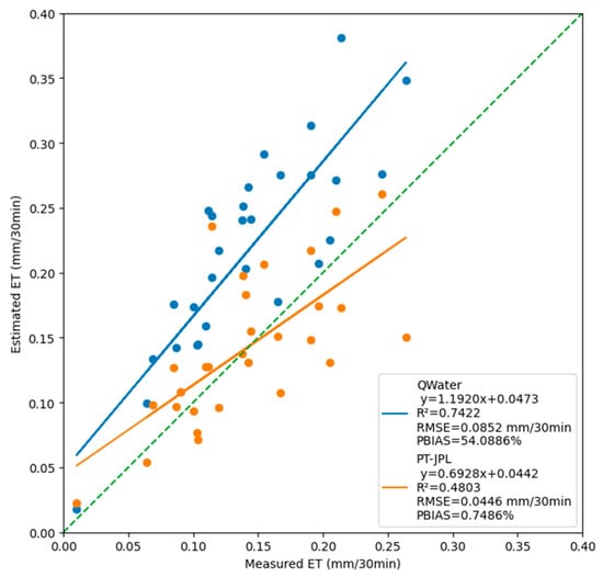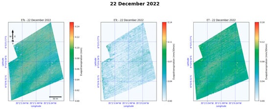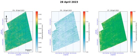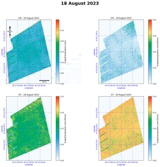 Understanding crop water use is essential for improving agricultural water management and ensuring sustainable food production, especially in regions with limited water resources. Evapotranspiration (ET) is a key component of the hydrological cycle, directly influencing irrigation planning and crop productivity. However, accurately estimating ET at local scales remains a challenge due to the limitations of conventional measurement methods and the difficulty of integrating high-resolution remote sensing data. This study investigates the estimation of terrestrial evapotranspiration (ET) in a sugarcane cultivation area located in the northern coastal region of Paraíba, Brazil, using meteorological data and aerial images acquired by an Unmanned Aerial Vehicle (UAV). We adapted the PT-JPL model to estimate ET at the local scale, using thermal and multispectral imagery obtained from UAVs. Data validation was performed using surface energy balance measurements obtained from a micrometeorological tower, thereby enabling comparison of estimated and observed ET values. The results demonstrated strong correlations between modeled predictions and field measurements of net radiation (R2 = 0.85), with performance metrics indicating moderate reliability for local-scale simulated ET when compared to flux-tower-based ET (R2 = 0.48; RMSE ≈ 0.045 mm/30 min). This research highlights the potential of integrating UAV-based remote sensing with the PT-JPL model to improve understanding of crop water use, support irrigation management, and contribute to sustainable agricultural practices. Full article