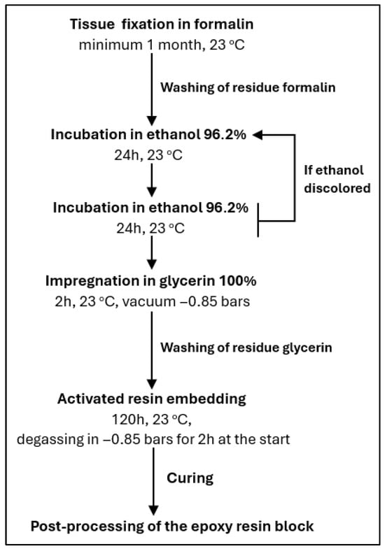 Organ preservation is a necessary and diverse process in morphological studies and is traditionally achieved through formalin fixation and plastination. A comparatively innovative method is organ embedding in epoxy resin, which provides durable and non-toxic models during manipulation. This study aimed to create 30 models: 12 from human specimens and 18 from animal specimens. Samples were incubated in 96.2% ethanol for 24 h to disinfect and remove formalin and excess fat, followed by 100% glycerol incubation for 2 h under vacuum to create a protective interface between the tissue and the activated epoxy resin. Afterward, the tissues were fixed in scaffolds and embedded in epoxy resin. Once hardened, the models were post-processed to enhance clarity and longevity. Each model was mounted on a wooden platform featuring a QR code linking to a presentation describing the visible anatomical structures. Some modifications were made to previously described protocols to optimize the method, improving quality and reducing preparation time. Among the 30 models, two anatomical and two clinical cases of organ preservation were especially interesting. Despite the numerous challenges and limitations, this method yields promising potential for morphological studies, allowing safe organ manipulation without protective equipment and anatomical documentation via QR code-linked presentations. Full article
