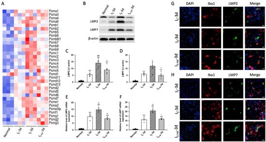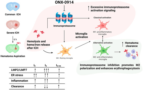 Intracerebral hemorrhage induces severe secondary brain injury characterized by excessive neuroinflammation and inefficient hematoma clearance, processes largely governed by microglial polarization and phagocytic activity. The immunoproteasome, an inducible proteasome isoform involved in immune regulation, has been implicated in inflammatory neurological disorders, but its role in microglial responses after ICH remains unclear. In this study, rat models of common hemorrhage, severe hemorrhage, and severe hemorrhage with hematoma aspiration were used to represent graded injury severity and post-evacuation recovery. Transcriptomic profiling at day 3 post-injury identified immunoproteasome-associated gene networks, while expression of the catalytic subunits LMP2 and LMP7, microglial polarization markers, and phagocytic receptors was analyzed by Western blotting and immunofluorescence. Severe hemorrhage markedly induced LMP2 and LMP7 expression, predominantly in Iba1+ microglia, accompanied by enhanced ER stress, NF-κB signaling, and M1-like polarization and reduced phagocytic marker expression. Hematoma aspiration attenuated immunoproteasome expression and restored M2-associated and phagocytic signatures. Consistently, pharmacological inhibition of immunoproteasomes in primary microglia enhanced erythrophagocytosis and promoted a reparative phenotype in vitro. These findings indicate that immunoproteasome activation links hemorrhagic severity to maladaptive microglial polarization and impaired hematoma clearance after ICH, and that reducing immunoproteasome expression may help rebalance inflammatory and phagocytic microglial functions. Full article