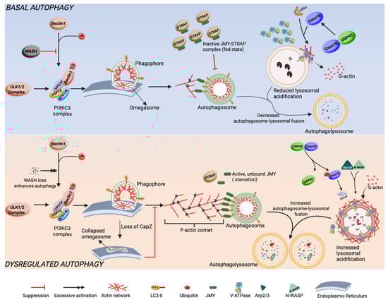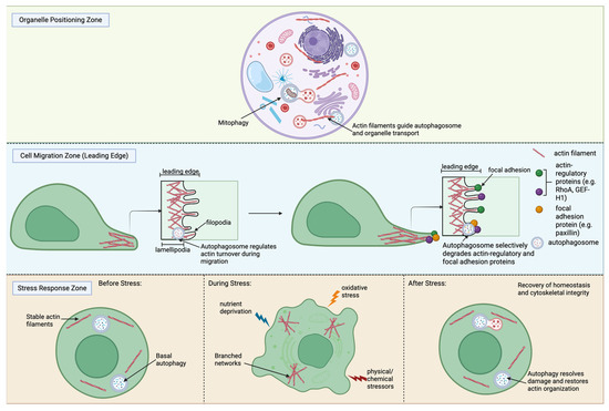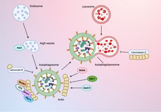 Actin is a key component of the cytoskeleton and plays diverse roles in cellular processes. Autophagy regulates homeostasis through various mechanisms that recycle nutrients and degrade unnecessary or harmful cellular components and aggregates. These two processes are engaged in a highly conserved crosstalk through which they regulate each other, including autophagolysosomal formation and regulation of actin dynamics. The regulation of autophagy is involved in cancer, neurodegeneration, infectious diseases, and inflammation, providing possible avenues for treatments for these diseases. In this review, we summarize current knowledge of the actin–autophagy interplay and regulation, and explore the possible implications for disease progression and therapies. Although more research is necessary to strengthen the effectiveness of therapies that target the regulation of autophagy and actin dynamics, significant strides have already been made, clearly indicating the potential benefit of targeting these processes. Full article