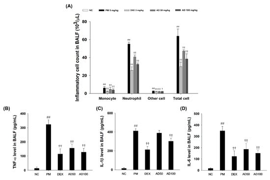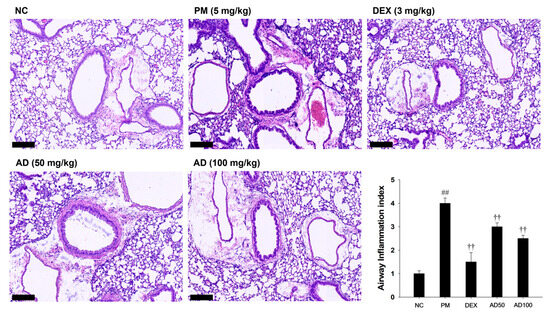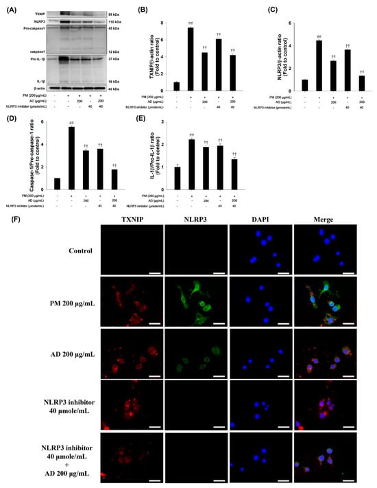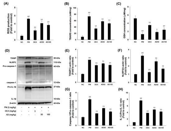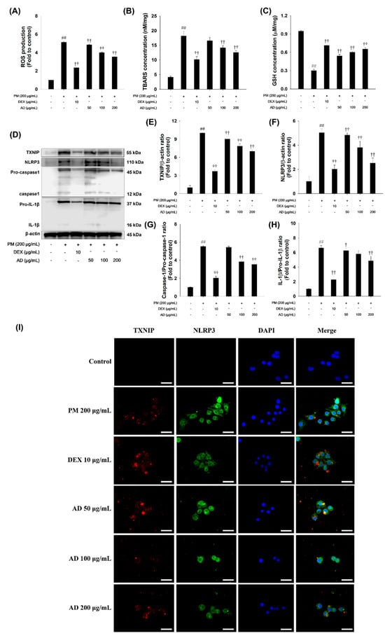 Particulate matter (PM) is a complex mixture of airborne solid particles and liquid droplets originating from various environmental sources, and it has been implicated in the initiation, development, and progression of pulmonary inflammation and respiratory diseases. However, the underlying associated molecular mechanisms remain unclear. Adenophora divaricate Franch. & Sav. (AD) is a medicinal herb classified within the Campanulaceae family and genus Adenophora, with a broad geographic distribution across East Asia, including Korea, Asia, and Russia. In this study, we investigated the mechanisms underlying the effects of AD on PM-induced lung inflammation in both PM-stimulated RAW264.7 cells and PM-exposed mice. Considering that the reactive oxygen species (ROS)-mediated thioredoxin-interacting protein (TXNIP) and NOD-like receptor pyrin domain containing (NLRP3) inflammasome pathway plays a role in PM-induced inflammatory responses, we focused on determining whether AD exerts its anti-inflammatory effects through modulation of this signaling pathway. The anti-inflammatory properties of the methanolic extract of AD were evaluated using PM-stimulated RAW264.7 cells and PM-exposed mice. PM was administered intranasally to mice for 7 days, whereas AD or dexamethasone was orally administered for the same duration. AD treatment significantly attenuated pulmonary inflammation, as evidenced by reduced inflammatory cell counts and decreased cytokine levels in bronchoalveolar lavage fluid. In addition, AD decreased oxidative stress marker (ROS and thiobarbituric acid reactive substances) while increasing glutathione content, leading to suppression of TXNIP/NLRP3 inflammasome expression. Histopathological analysis revealed a marked alleviation of inflammatory responses in lung tissue, characterized by diminished inflammatory cell infiltration and reduced alveolar wall thickening. Collectively, these findings suggest ROS-mediated TXNIP serves as a key regulatory factor, and AD may serve as a potential therapeutic agent for pulmonary inflammation. Full article