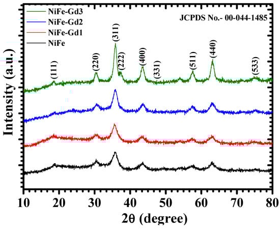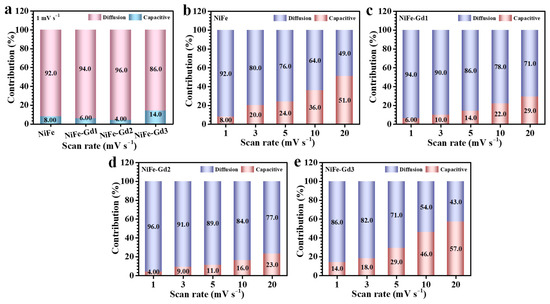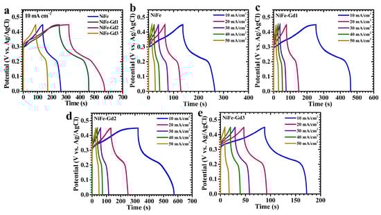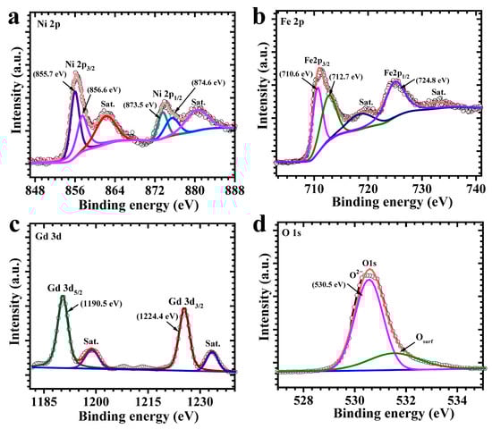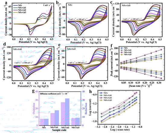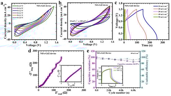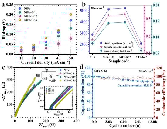 The rational design of electrode materials with tailored composition and architecture is crucial for advancing high-capability electrochemical energy storage systems. This study reports that gadolinium-modified NiFe2O4 nanosheet electrodes were effectively synthesized on nickel foam via a hydrothermal approach followed by thermal treatment. A series of compositions (NiFe, NiFe–Gd1, NiFe–Gd2, and NiFe–Gd3) were prepared to systematically examine the effect of Gd incorporation on structural features and electrochemical properties. X-ray diffraction (XRD) analysis confirmed the formation of the cubic spinel NiFe2O4 phase without detectable secondary phases, indicating that the crystal structure remains intact after Gd introduction. X-ray photoelectron spectroscopy (XPS) further verified the presence of Ni2+, Fe3+, and Gd3+ species within the lattice environment. Morphological analysis using field-emission scanning electron microscopy (FESEM) revealed a nanosheet-based architecture, where the optimized NiFe–Gd2 electrode exhibited a porous and interconnected nanosheet framework with abundant exposed edges. This structural configuration improves electrolyte penetration and facilitates efficient ion transport during charge storage processes. Electrochemical measurements demonstrated that the NiFe–Gd2 electrode delivers an areal capacitance of 5235 mF cm−2 at 10 mA cm−2, along with improved reaction kinetics and low internal resistance. An asymmetric supercapacitor assembled using NiFe–Gd2 as the positive electrode and activated carbon as the negative electrode operated stably within a 0–1.5 V potential window, achieving an energy density of 0.136 mWh cm−2 and a power density of 3.14 mW cm−2, while retaining 86.55% of its initial capacitance after 7000 cycles. These results highlight the potential of rare-earth engineering as a viable strategy for designing advanced spinel ferrite electrodes and pave the way for the development of high-performance, durable, and scalable supercapacitor systems for practical energy storage applications. Full article