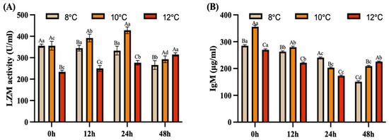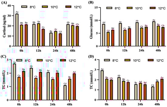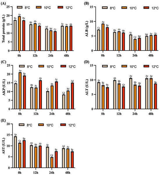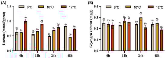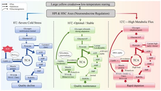 The large yellow croaker (Larimichthys crocea) is a high-value marine fish, but stress during live transport often leads to physiological disturbance and deterioration of muscle quality. This study investigated the effects of pre-transport temporary rearing at three temperatures (8, 10, and 12 °C) over 48 h on stress response, energy allocation, and muscle quality in this fish species. Temporary rearing at 8 °C induced stronger cold stress, characterised by elevated cortisol, marked lipid mobilisation, late lactate rebound, and greater loss of polyunsaturated fatty acids, indicating enhanced stress–catabolism coupling and higher risk of quality deterioration. In contrast, 12 °C did not sufficiently suppress metabolic turnover, resulting in continuous glycogen depletion, rapid ATP degradation, and accelerated accumulation of bitter-tasting nucleotide metabolites such as hypoxanthine. Among the tested temperatures, 10 °C showed the most coordinated response, with relatively stable endocrine status, moderate substrate utilisation, lower accumulation of undesirable degradation products, and better preservation of texture, water-holding capacity, and flavour-related precursors. These findings suggest that 10 °C is a promising pre-transport temporary rearing temperature for large yellow croakers under the present 48 h experimental conditions. The advantage of this temperature appears to lie in achieving a more favourable balance between metabolic suppression and physiological homeostasis, thereby providing a scientific basis for improving pre-transport rearing management and supporting safer, more stable live transport. Future studies incorporating behavioural and molecular indicators are needed to further clarify the regulatory effects of 10 °C during pre-transport rearing. Full article