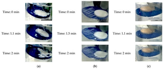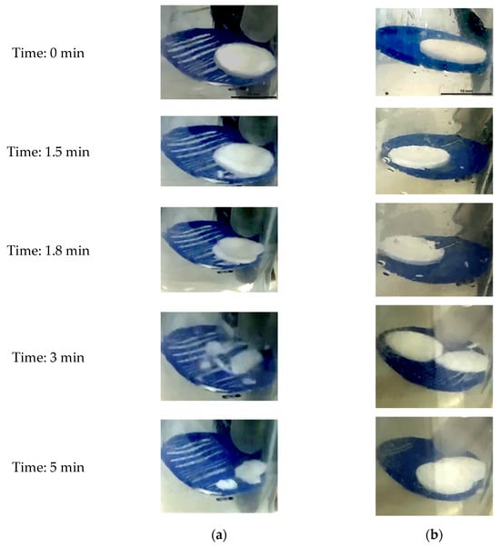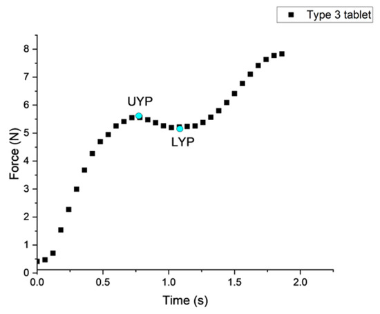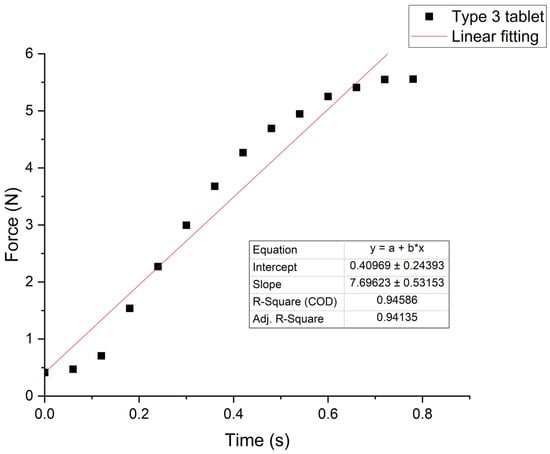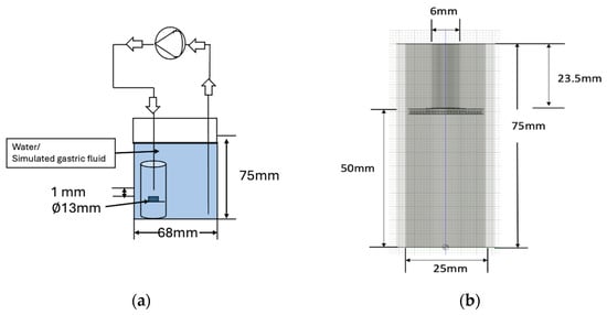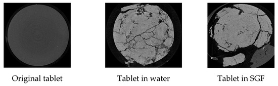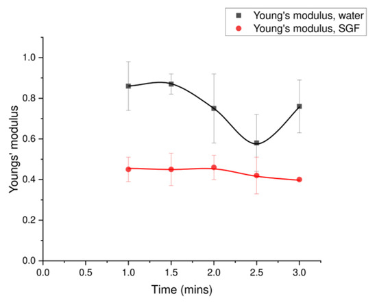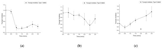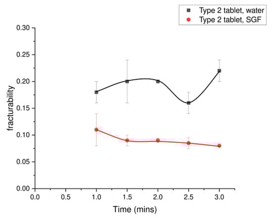 Three food-like tablet types, with Young’s moduli similar to those of real foods, were prepared to investigate breakup during digestion using caffeine as a model solute. Texture was evaluated in situ during simulated digestion by measuring Young’s moduli and fracturability at various time points, providing indicators of stiffness and toughness. Type 1 disintegrated immediately; Type 2 dissolved first, followed by breakup at (1.5 ± 0.2) min, and Type 3 underwent dissolution. Young’s modulus decreased rapidly for Type 1 within a minute (from 1.00 to 0.38 MPa), while Type 2 exhibited a decrease at 1.5 min (0.94–0.58 MPa) before breakup. Type 3 resisted disintegration due to its higher modulus of elasticity. The time-dependent decrease in Young’s modulus is consistent with previous studies, suggesting that soft materials are more readily broken down. In simulated gastric fluid (SGF), Type 2 displayed similar dissolution and breakup behaviour (1.8 ± 0.04) min, followed by structural stabilisation due to swelling, with a slight decrease in modulus and fracturability at breakup. The study introduces a novel method that combines time-resolved, in situ textural measurements with real-time visual observation under physiologically relevant pulsatile flow, using purpose-designed food-like model materials to support the prediction of food breakdown behaviour and the design of foods with controlled digestion. Full article