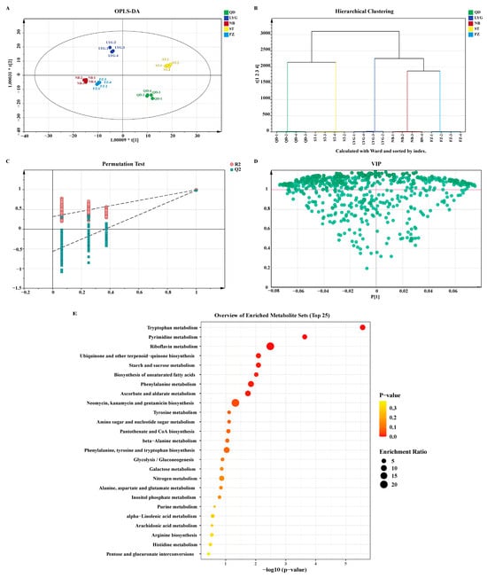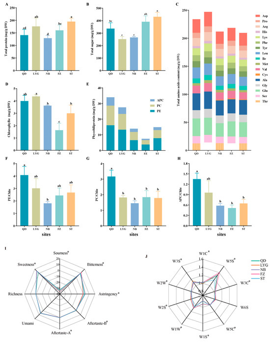Pyropia haitanensis, an economically significant cultivated seaweed in China, exhibits substantial geographical variations in nutritional and sensory qualities that influence its market value. The nutritional quality of the samples, including total sugar, total protein, and amino acid content, as well as color quality, assessed through phycobiliprotein and chlorophyll content, and sensory quality evaluated using an electronic nose and electronic tongue, were determined. To elucidate these quality variations, this study employed an integrated metabolomics and chemometrics approach to analyze samples from five major cultivation regions. Principal component analysis (PCA) effectively differentiated the samples; orthogonal partial least squares discriminant analysis (OPLS-DA) validated this classification with robust model parameters (R2X = 0.791, R2Y = 0.995, Q2 = 0.984) and identified key discriminatory metabolites. Weighted gene co-expression network analysis (WGCNA) identified origin-specific metabolic modules correlated with quality traits, revealing that pathways such as cysteine and methionine metabolism underpin the observed differences in flavor profiles across cultivation regions. Furthermore, mediation analysis quantitatively confirmed that inorganic nitrogen primarily influences key flavor attributes by regulating sulfur-containing amino acid and nucleotide metabolism. This study systematically elucidates the metabolic mechanisms governing quality formation in P. haitanensis, providing a scientific foundation for quality control and geographical origin traceability. Full article