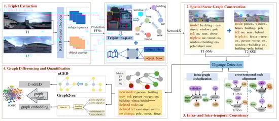Street-view imagery supports fine-grained urban monitoring, but most street-scene change detection methods are pixel-centric or object-centric and cannot explicitly capture the evolution of inter-entity spatial relations needed for interpretable tasks (e.g., compliance inspection and post-disaster assessment). To address this, we propose SSPRCD, a scene graph-based framework that extracts entity-relation triplets with pixel locations, builds spatial knowledge graphs, and achieves stable node alignment via intra-/inter-temporal consistency. Graph differencing then identifies added, removed, and unchanged entities/relations, while nGED and graph2vec jointly quantify structural discrepancies between temporal scenes. Experiments on the TSUNAMI dataset, with comparisons across two object detectors and seven scene graph generation backbones, show that SSPRCD achieves a macro-F1 of 0.65 for the object-level task, F1 of 0.72 for binary change detection, and F1 of 0.89 for relation-level detection, consistently outperforming baseline methods. Overall, SSPRCD delivers relation-aware and topology-informed change explanations that improve the interpretability of street-block level change analysis for geospatial in-formation updating and urban applications. Full article