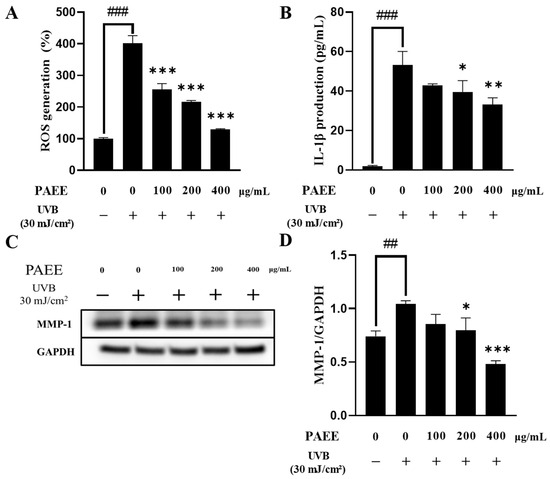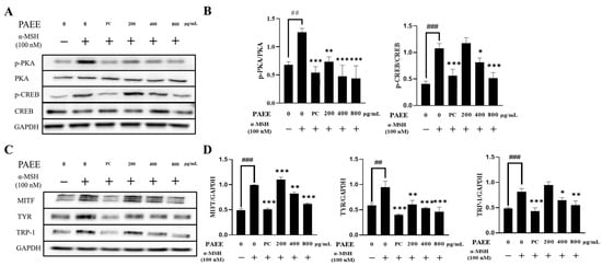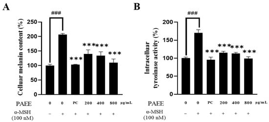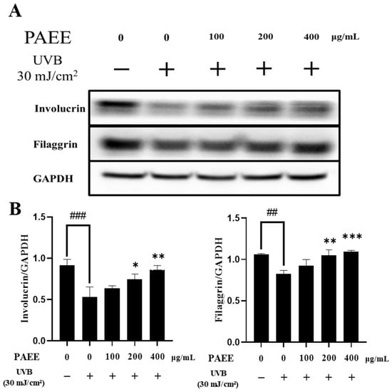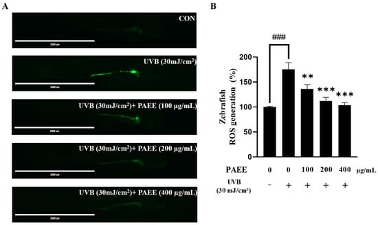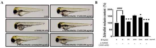 Ultraviolet (UV) irradiation induces complex skin damage, including hyperpigmentation, oxidative stress, and alterations in proteins related to keratinocyte differentiation and epidermal barrier-associated status. This study investigated the multifunctional protective effects of Padina arborescens ethanolic extract (PAEE) against skin damage in melanocytes, keratinocytes, and zebrafish. In alpha-melanocyte-stimulating hormone (α-MSH)-stimulated B16F10 cells, PAEE effectively suppressed the protein kinase A (PKA)/cyclic adenosine monophosphate (cAMP) response element-binding protein (CREB) signaling pathway, which was associated with reduced expression of microphthalmia-associated transcription factor (MITF) and tyrosinase, leading to decreased melanin synthesis. PAEE also exhibited photoprotective properties by reducing reactive oxygen species (ROS), inhibiting interleukin-1 beta (IL-1β), and attenuating matrix metalloproteinase-1 (MMP-1) upregulation associated with UVB (ultraviolet B)-induced photodamage in HaCaT keratinocytes. Notably, PAEE restored the UVB-reduced expression of filaggrin and involucrin, representative markers of keratinocyte differentiation and epidermal barrier-associated status, in HaCaT keratinocytes. In zebrafish embryos, PAEE suppressed α-MSH-induced melanin accumulation and UVB-induced ROS generation at non-toxic concentrations. Taken together, these results suggest that PAEE exerts anti-melanogenic and photoprotective effects in cellular and zebrasfish models and may serve as a promising marine-derived ingredient for cosmeceutical applications targeting UVB-related skin damage. Full article