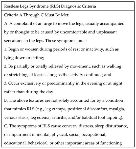 Restless legs syndrome (RLS) is one of the most prevalent sleep disorders, yet its diagnosis continues to rely almost entirely on subjective symptom descriptions. This persistent dependence on phenomenology reflects the absence of reliable biological markers to aid in the process of diagnosis [...] Read more.