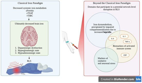 Restless legs syndrome (RLS) is one of the most prevalent sleep disorders, yet its diagnosis continues to rely almost entirely on subjective symptom descriptions. This persistent dependence on phenomenology reflects the absence of reliable biological markers to aid in the process of diagnosis or monitoring. However, there is accumulating molecular evidence that suggests that RLS is associated with systemic biological alterations. These extend beyond the traditional paradigm of iron deficiency. The present scoping review synthesizes the current research on circulating serum biomarkers investigated in RLS outside classical iron indices. A comprehensive search of PubMed, Scopus, and Web of Science databases identified 1050 records, of which 50 studies met eligibility criteria and were included. In the processing of data, clusters emerged into several recurring biological domains, including dysregulated iron regulatory signaling (hepcidin), low-grade immune activation, oxidative stress, and neuroaxonal injury markers. High-throughput omics studies reveal molecular network perturbations involving inflammatory pathways, complement activation, metabolic signaling, and cellular stress responses. Biomarker associations appear stronger when linked to objective motor burden. These findings suggest that RLS may involve multifarious molecular changes detectable in the serum. Consequently, this can support the transition from symptom-based diagnosis toward biomarker-informed stratification, which may enable more precise disease characterization and improved diagnostic accuracy. Full article