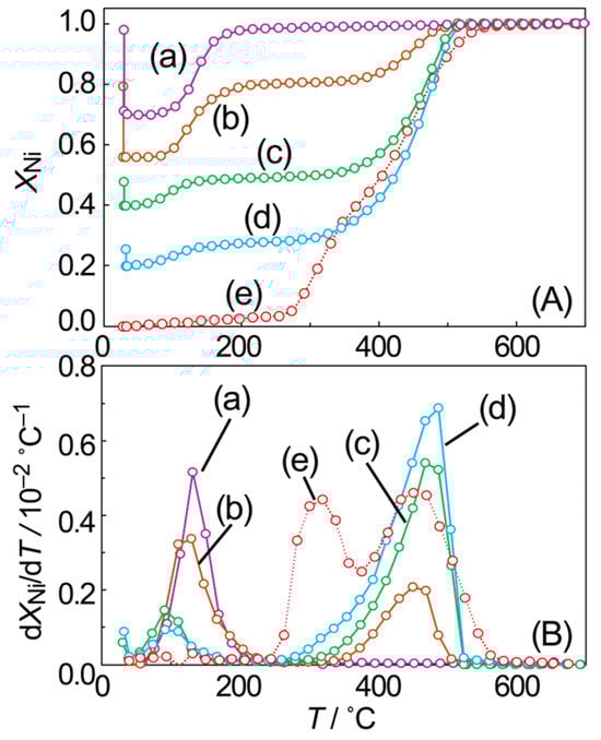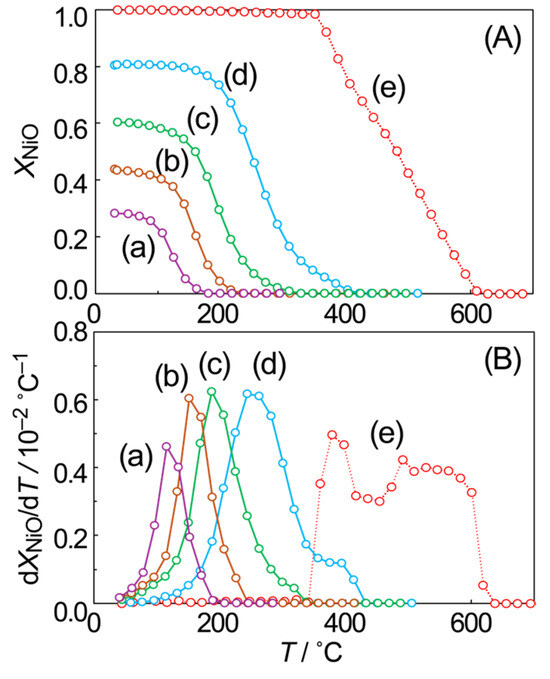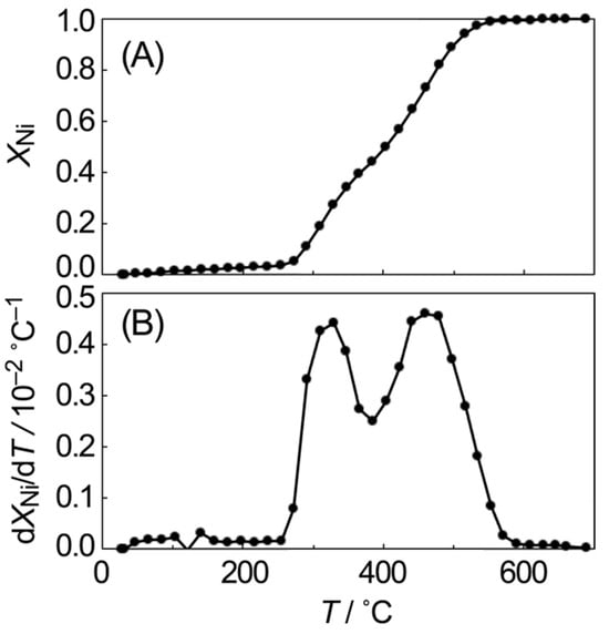 The redox mechanisms of silica-supported Ni particles were investigated using their in situ X-ray absorption fine structure, providing mechanistic insights into partially reduced NiO and partially oxidized metallic Ni. The results of surface oxidation of partially reduced NiO particles at room temperature revealed that the surface was not fully covered with metallic Ni and that metallic Ni had also formed within the particle interior. During NiO particle reduction, the process initiates at specific surface sites, and before the metallic Ni phase fully covers the surface, O2− ions are expelled from the particle. Conversely, the oxidation of metallic Ni particles progresses inward from the surface, with an accompanying increase in the thickness of the NiO layer that forms upon O2 exposure at room temperature. This mechanism is supported by observations that the reduction of a thin NiO shell on metallic Ni particles was completed below 200 °C, while reduction temperatures shifted to higher values as the NiO layer thickness increased. The distinct oxidation and reduction mechanisms are attributed to differences in the migration direction of O2− ions. During reduction, it is proposed that O2− ions within the particles migrate to the surface along the interface between the NiO phase and the metallic Ni phase. This study elucidates the detailed mechanism behind the redox interconversion between NiO and metallic Ni in solid catalyst particles. Full article