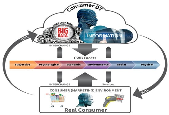 Consumer wellbeing systems are characterized by conceptual fragmentation, heterogeneous data sources, and multilevel interactions across economic, psychological, social, and environmental domains. Existing monitoring approaches remain largely unidimensional and lack integrative system architectures capable of supporting real-time, adaptive analysis. This paper proposes a Federated Digital Twin (FDT) framework for Consumer Wellbeing Systems, designed to integrate decentralized, multimodal data while preserving autonomy and privacy. The proposed architecture builds on a five-dimensional digital twin model and extends it through federated interoperability, data fusion, adaptive learning, simulation capabilities, and human-in-the-loop mechanisms. The framework enables the synchronization of observed, self-reported, contextual, and synthetic data across distributed environments, supporting system-level modeling, prediction, and optimization. As an illustrative application, the paper examines Shopping Wellbeing and Shopping–Life Balance as sub-systems within broader wellbeing ecosystems, demonstrating how federated digital twins can unify fragmented theoretical constructs into a coherent, dynamic monitoring structure. The study contributes a system-oriented conceptual architecture for modeling complex human-centric wellbeing ecosystems and outlines implications for systems design, governance, and future interdisciplinary research. Full article