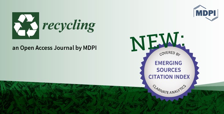 We are pleased to inform you that the journal Recycling (ISSN 2313-4321) has been accepted for inclusion in the Emerging Sources Citation Index (ESCI) in the Web of Science in August 2021.