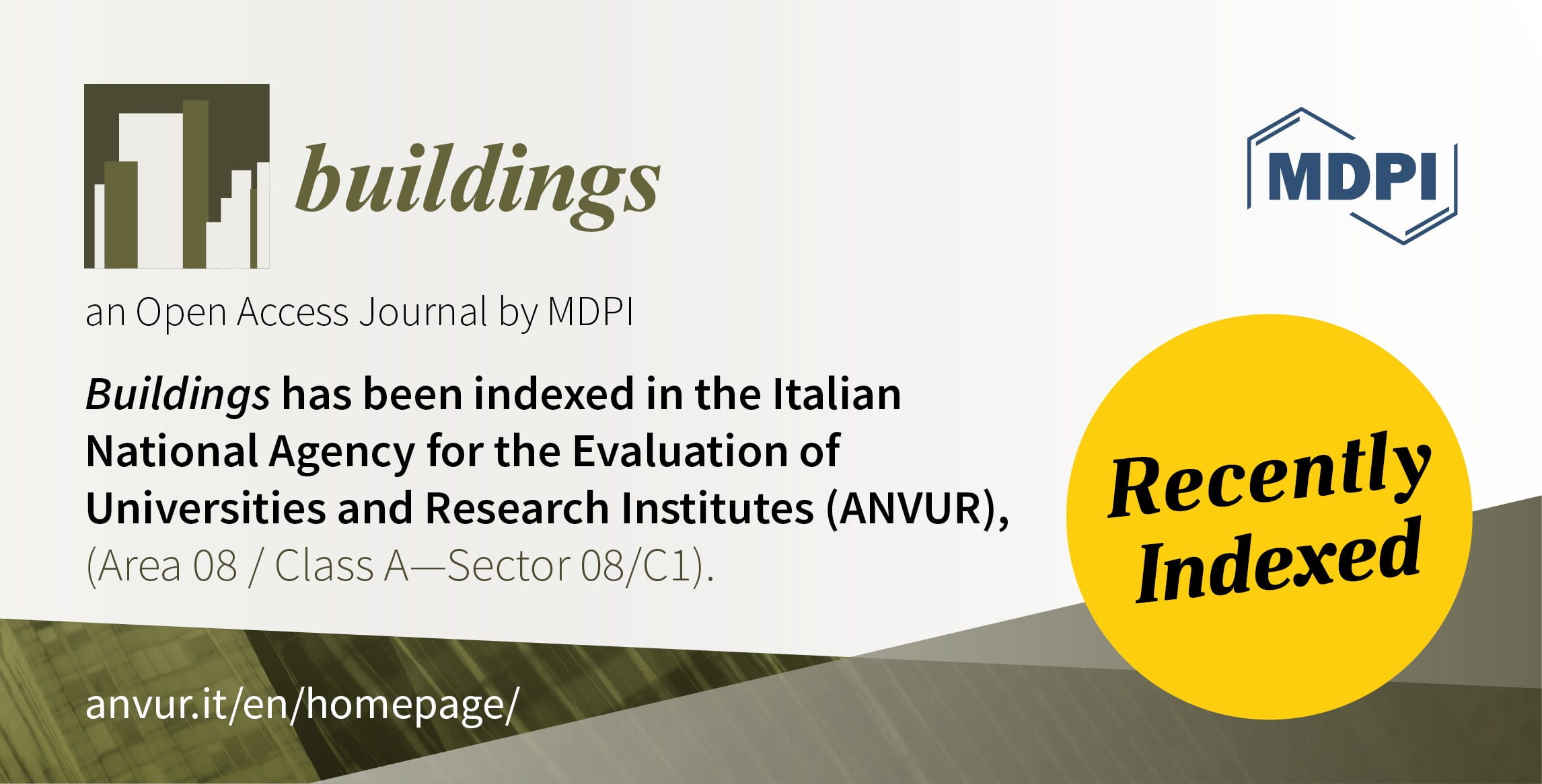 We are pleased to inform you that the open access journal Buildings (ISSN: 2075-5309; IF: 3.324) has been indexed in the Italian National Agency for the Evaluation of Universities and Research Institutes (ANVUR) (Area 08 / Class A—Sector 08 / C1).