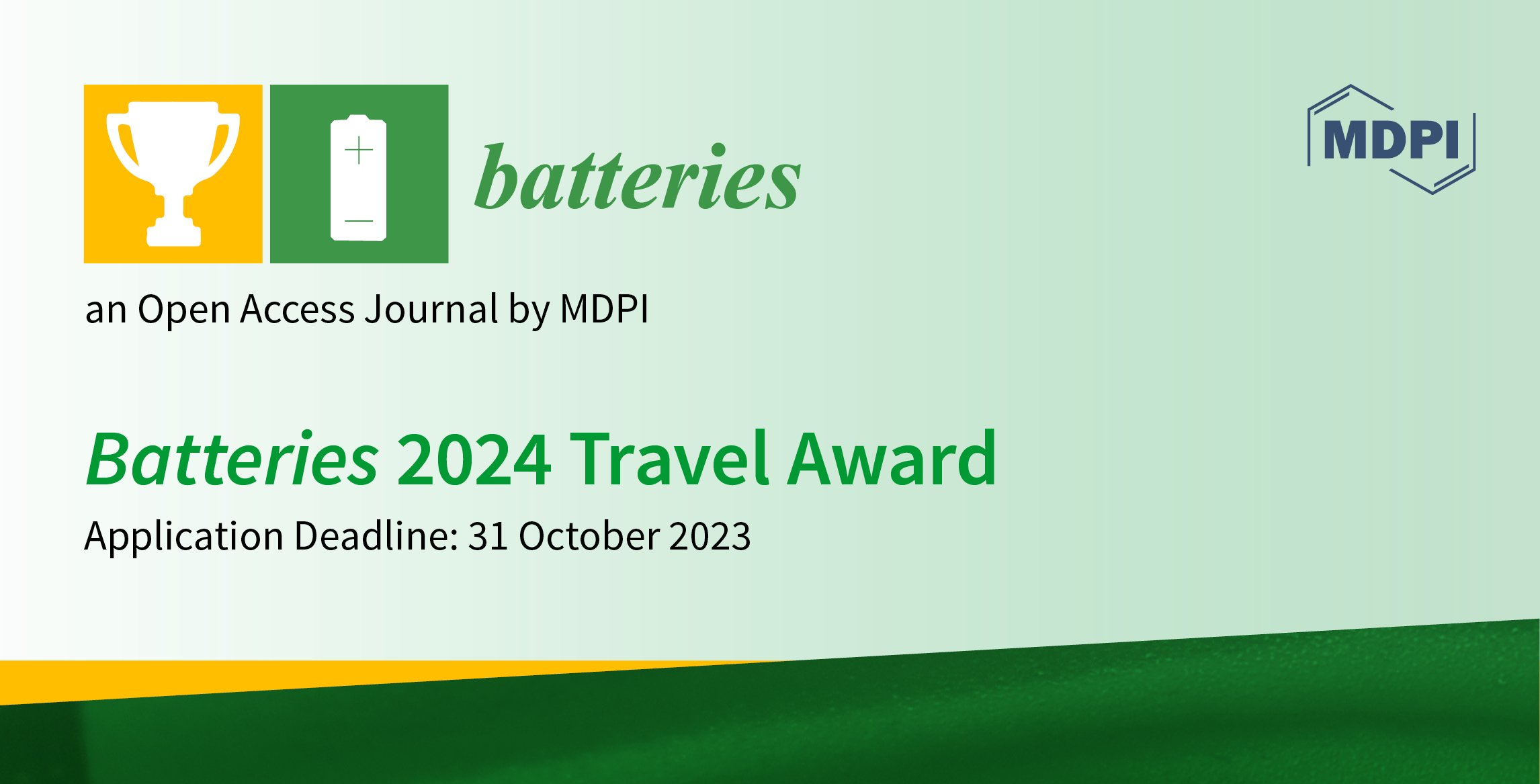 Please submit your applications for the Batteries 2024 Travel Award at https://www.mdpi.com/journal/batteries/awards/2402 by 31 October 2023. Prizes will be awarded at the end of December 2023 and announced on the Batteries website.