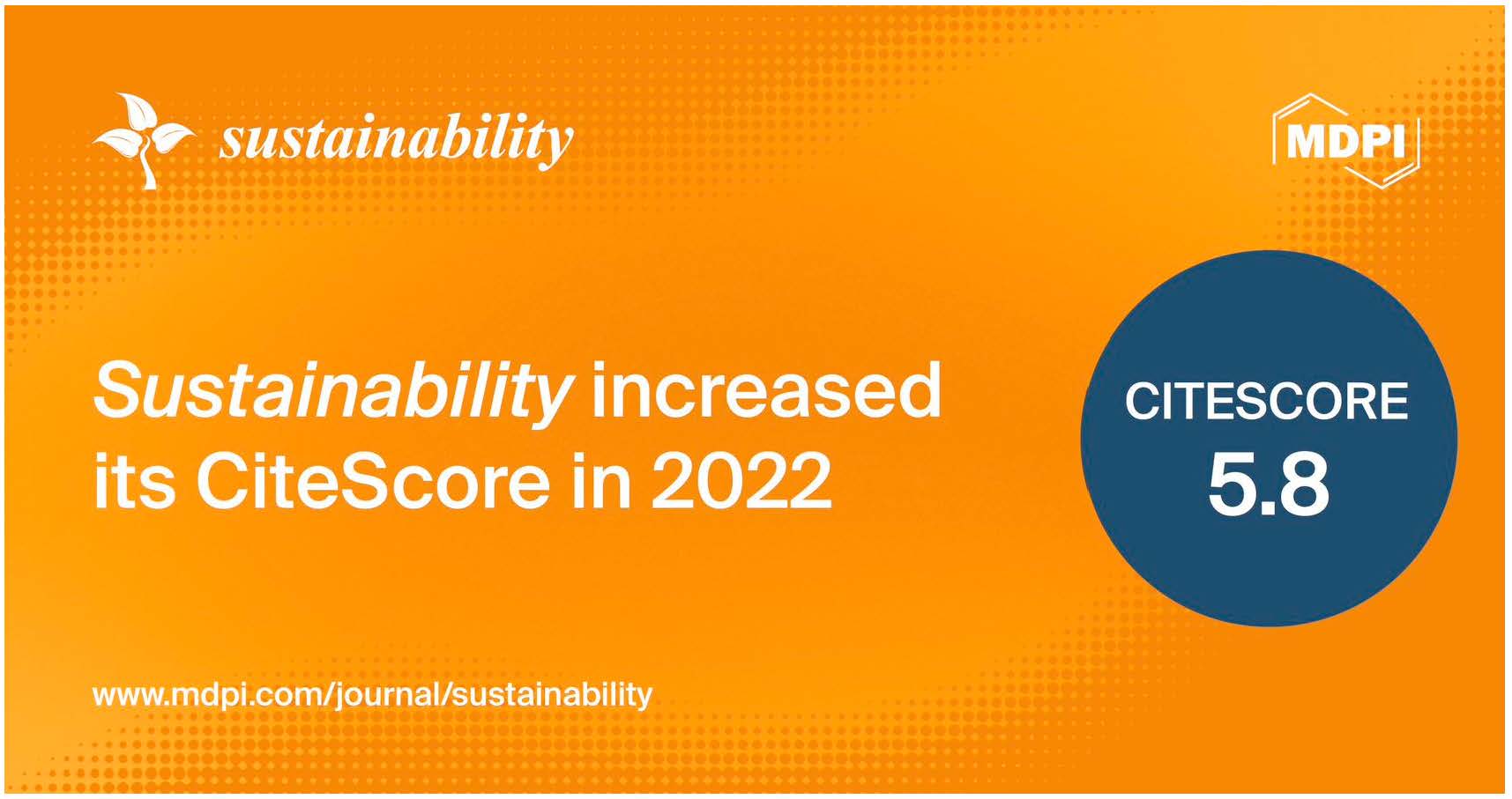 We are pleased to inform you that Sustainability (ISSN: 2071-1050) has received an updated CiteScore of 5.8, an increase of 16% compared with the 2021 metric. The 2022 CiteScore™ was released recently, making an assessment of the scientific influence of journals in the 2019 to 2022 period.