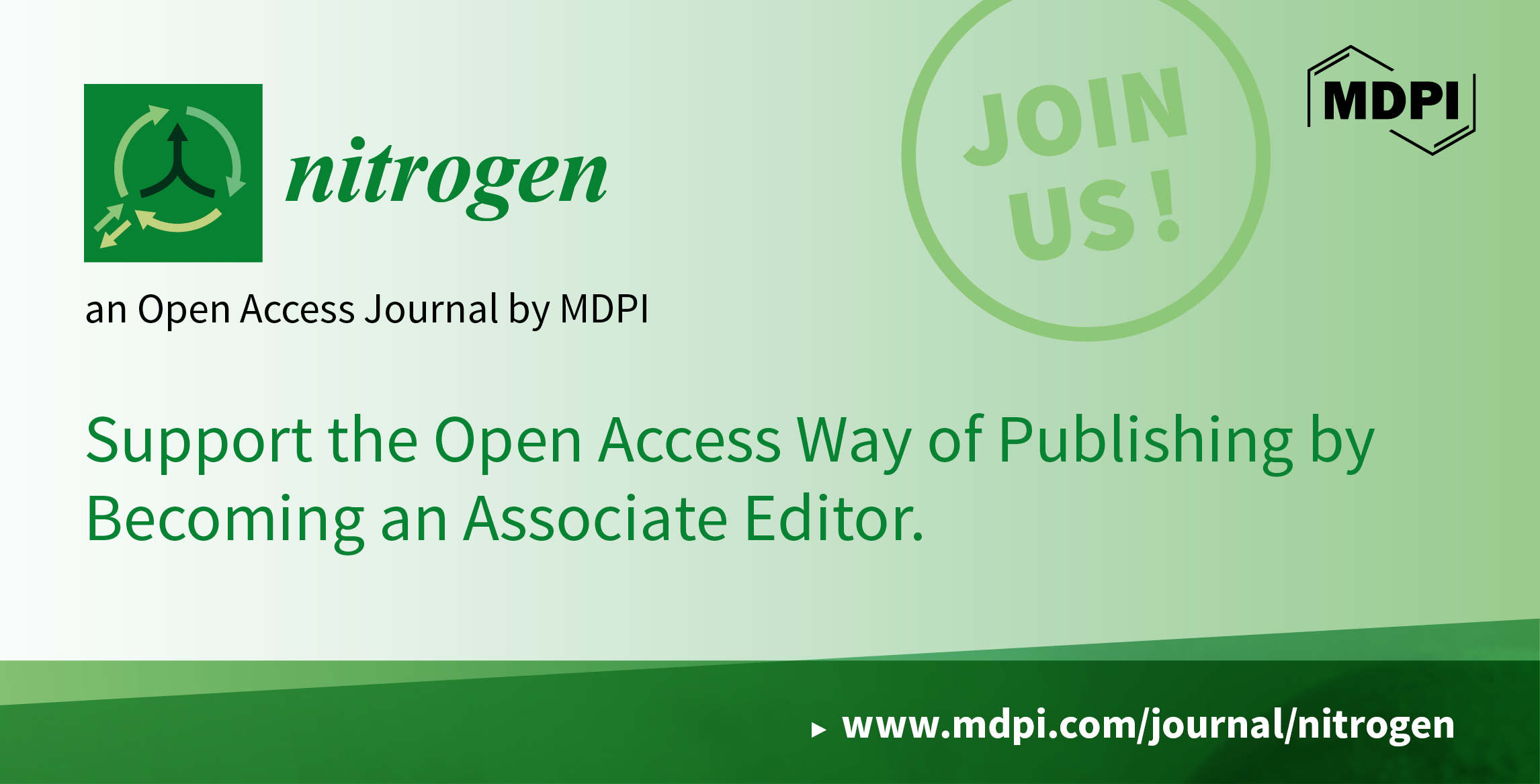 Nitrogen (ISSN: 2504-3129) is an international, open access journal covering the whole field of nitrogen research, but special emphasis is placed on the nitrogen cycle. You can learn more about the journal at the following link: https://www.mdpi.com/journal/nitrogen/about. The journal is indexed within ESCI (Web of Science), Scopus, SciFinder, and other databases. In order to adapt to the development of the scale of the journal and ensure its sustainability, we are now recruiting for the position of Associate Editor of the journal Nitrogen. The duties and requirements are as follows: