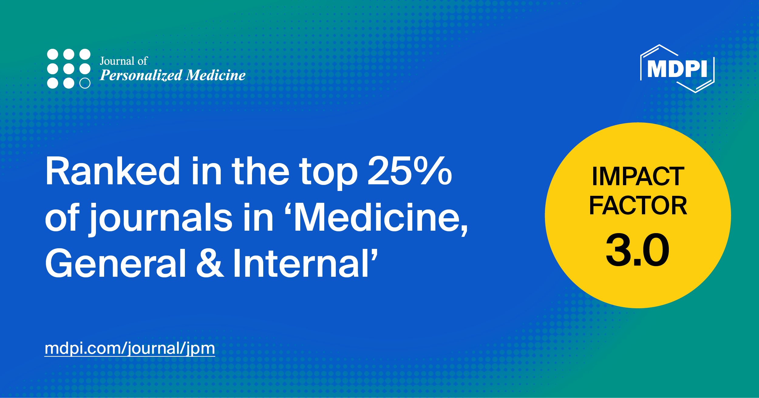 We are pleased to share that Journal of Personalized Medicine (JPM, ISSN: 2075-4426) was awarded an updated Impact Factor of 3.0 in the 2023 Journal Citation Reports™ released by Clarivate in June 2024. Journal of Personalized Medicine ranks Q1 (58 among 325 titles) in the “Medicine, General & Internal” category and Q2 (51 among 174 titles) in the “Health Care Sciences & Services” category.