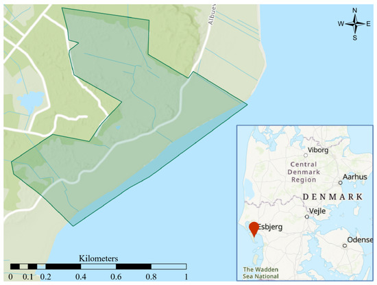 The 65 ha study area on Fanø in the southwest of Denmark. The dark green area marks the area encompassing the largest iteration of the virtual enclosure. The coordinates of the upper left corner of the map frame are 82633 E 552428 N.