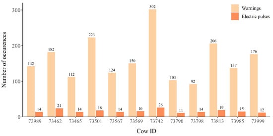The twelve cows received 197 electric impulses with each cow receiving between 11 and 26 electric impulses. The cows received 1949 warnings with each cow receiving between 92 and 302 warnings (Figure 2).