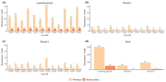 Average number of auditory warnings and electric impulses received per week by (a) each individual in the learning period, (b) each individual in period 1, (c) each individual in period 2, and (d) by the entire herd during each of the three periods.